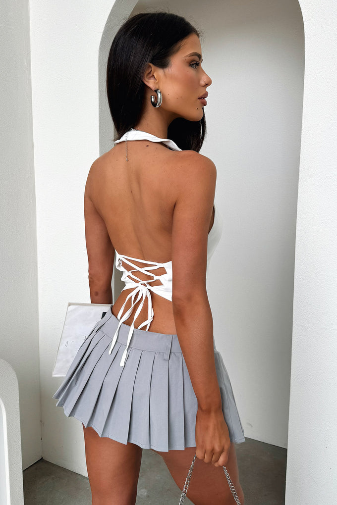 The Alonzo Top is perfect for your next night out! The halter neckline adds a touch of elegance, while the hook and eye closure down the front ensures a secure fit. The criss cross tie up back adds a fun, flirty twist. Made with double lined material, this top is both comfortable and stylish. Pair it with some low rise jeans for a complete look!