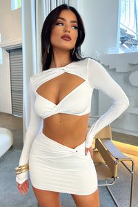 Looks that could kill! The Anesha Mini features a bodycon fit, double lined material and an asymmetrical waistline with a knot tie detail at the waist. Pair her with the matching crop, stiletto heels and a red hot lip!