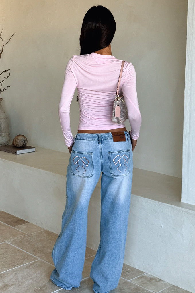 Mix comfort and style with the Avelyn Low Rise Jeans in blue! Featuring a trendy wide leg fit and playful rips, these jeans stand out with pink bow embroidery on the pockets and a signature THATSSOFETCH leather patch. Designed with belt loops, a double snap button, zip front closure, and four functional pockets, they blend practicality with flair. Pair them with a cute crop top and sneakers for an effortlessly cool, casual look!