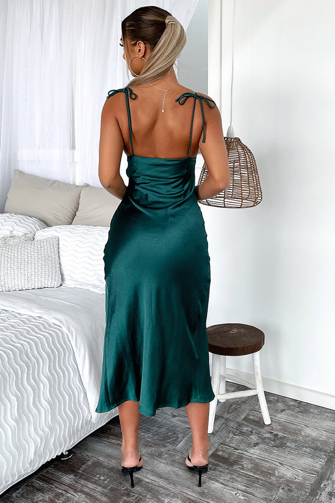We've got your formal needs covered with the gorgeous show stopping Bailey Dress in Emerald. She is such a darling, featuring a gathered bust, a silky soft satin fabric all over, dainty, tie up spaghetti straps and a cheeky split on the left leg. She's perfect for any formal event paired with black heels, dainty silver jewellery and a mini clutch for an elegantly beautiful look.