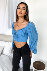 She's a total catch! Our Burnley crop showcases long balloon sleeves with cuffed ends, a gathered bust detail with ruffles edges, a cut out, tie up detail in between the bust and a shirred back for extra stretch. Pair this beaut with a white leather skirt and your go to strappy heels for a simple yet stylish look.