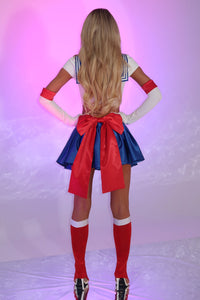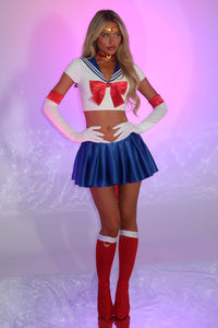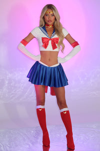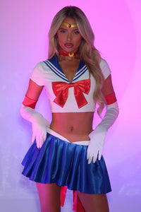 Get ready to shine in this playful three-piece Cosmic Power set! It features a soft, stretchy cropped tee with an adorable bow and sailor collar, paired with a flirty mid-rise pleated mini skirt with built-in shorts, an invisible back zip, and a detachable big red bow for extra flair. Complete the look with white stretchy gloves accented in red. Don’t forget to add the matching accessory kit to truly power up your outfit!