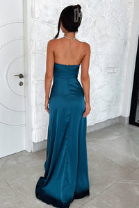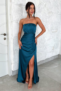 Get ready to turn heads in the Fleur Maxi Dress! This stunning dress features a strapless neckline and structured top for a flattering fit. The flowy skirt and ruching on the side add a touch of elegance, while the invisible back zipper and thigh high split provide functionality. Perfect for your next event, just add simple heels and jewellery for a sophisticated look!