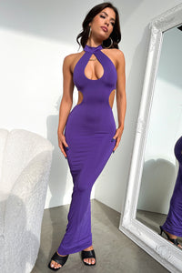 The Maxi of your dreams! She offers a soft double lined material, a high halter neck with sleeves cuts, a cut out detail between the bust and at the sides of the waist, a bodycon fit and an invisible back zipper. Style this goddess with white heels and gold jewellery for a delicate cocktail fit.