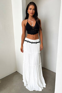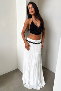 Add some playfulness to your wardrobe with our Harkee Crop! This little crochet knit top features a tie-up back and halter straps, along with a v-shaped hem. Perfect for a beach club day, pair it with a mini skirt and sandals, and you're ready to go!