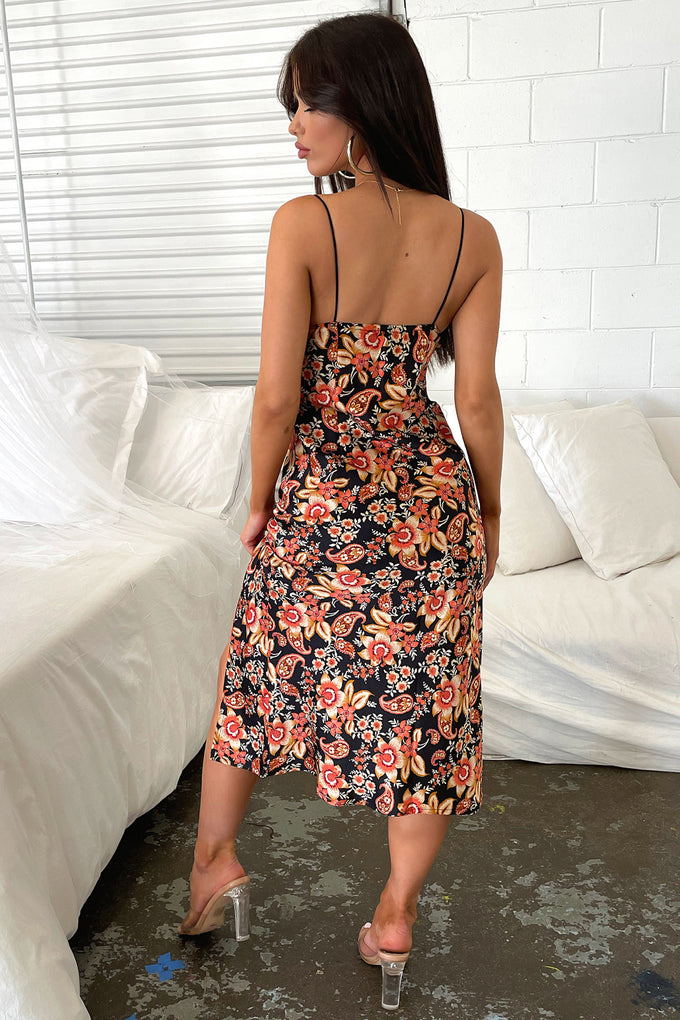 Jennifer Satin Midi Dress - Black Floral