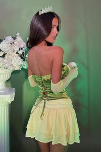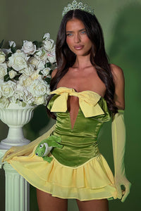 This playful three-piece set features a strapless satin top with a flattering V neckline and boning, highlighting a gathered bust adorned with a big yellow bow trimmed in silver glitter. The lace-up back ensures a perfect fit. The low-rise mini skirt has a thick gathered waistband and layered design with an invisible side zip and hook closure for a seamless look. Complete your outfit with elbow-length yellow mesh glittery gloves. For extra magic, pair it with the green princess tiara and the Kiss The Fro accessory for a truly enchanting style!
