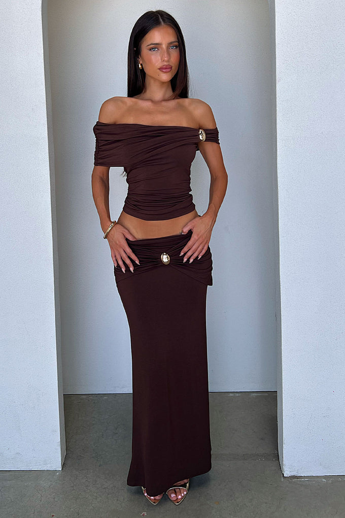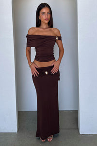 The gorgeous Malika Maxi Skirt is designed to hug your curves in all the right places! Featuring a flattering low-rise fit and crafted from soft, stretchy fabric, this bodycon style is elevated with an outer panel and bold gold circle hardware detail at the front. Pair it with the matching Malika Top and black heels for the ultimate drinks-with-the-girls look!