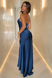 Get ready to turn heads with the Oscar Maxi Dress! This strapless dress features boning in the front for a flattering fit, along with an invisible back zipper for easy wear. The double lined bust provides extra support, while the side slit adds a touch of sultriness. Complete the look with heels and gold jewellery for a stunning ensemble!
