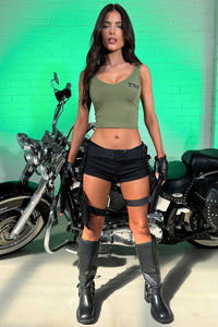 Complete your adventurous look with the Raider Crop in Khaki. This low cut crop top features the TSF logo and pairs perfectly with the Rider Shorts, Finger-less Gloves, and Leg Holster!