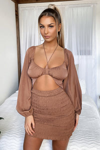 The absolute queen, it's the new Raina Dress in Brown! This beauty features a cheeky cut out detail underneath the bust, a tie up detail at the waist, long balloon sleeves with cuffed ends, that can be worn on or off the shoulder and shirred fabrication all over for extra stretch. Pair her with white some white heels and a lil baguette bag for a cute Sunday lunch look.