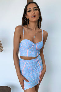 Cute florals all around for this season! The Rosie skirt details ruched fabrication all around, double lined material with a mesh top layer, an elasticated waist band and some dainty boning detail down the front. Style this babe with the matching crop, white sneakers and a white cardi for a cute girl look.