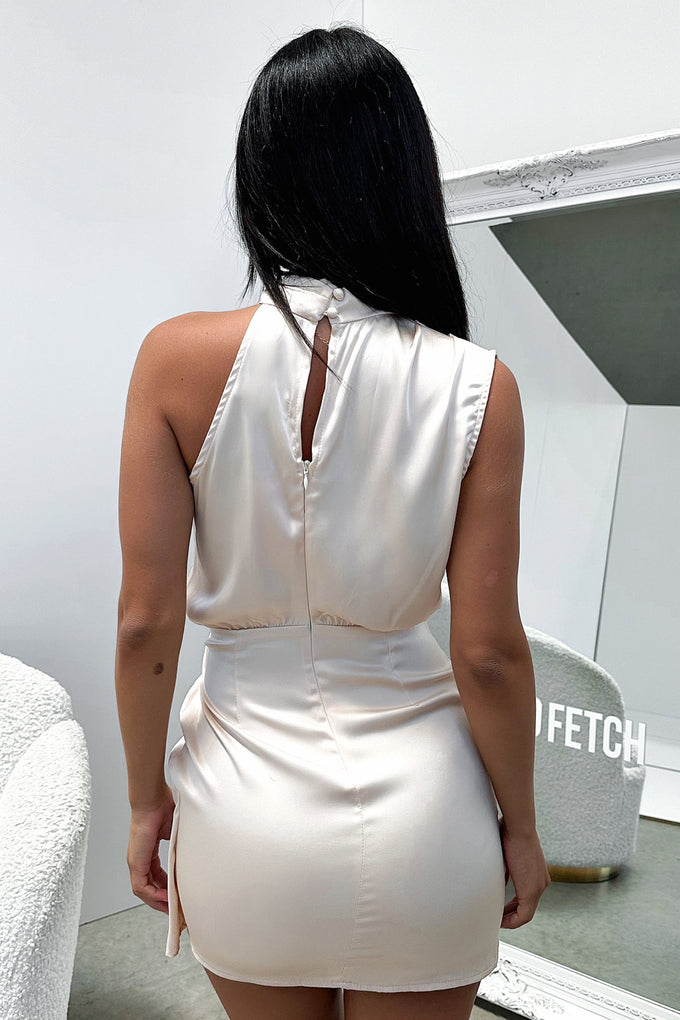 Sophisticated and classy, in the gorg little Santorini Dress! She features a high neckline with an asymmetrical sleeve cut, flowy fitting skirt with a wrap and tie design, silky soft material and a cut out detail at the back with a button + zip closure. Match her with Black Heels and a bold Red lippy.