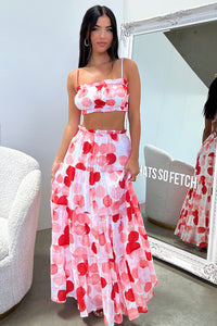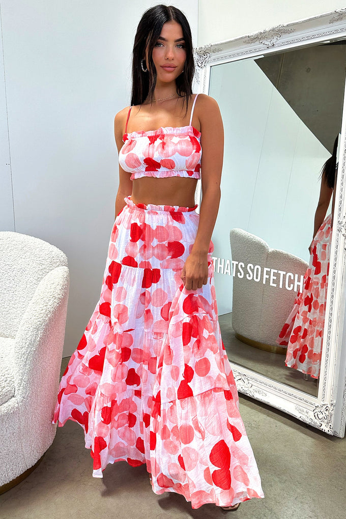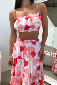 Summer vibes in the Selina Set! This gorg crop offers a frilly neckline with an elasticated band for lots of stretch, double lined material and thin adjustable straps. Style her with the matching skirt and a pair of White Sandals.