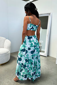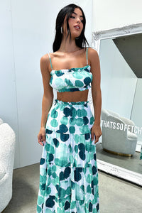 Summer vibing in the Selina Set! This gorg maxi skirt features an elasticated waistband with frilled edges, a flowy fitting skirt and double lined material. Style her with the matching crop and a pair of White Sandals.