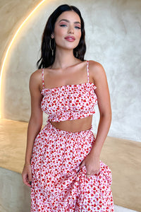 Summer vibing in the Selina Set! This gorg maxi skirt features an elasticated waistband with frilled edges, a flowy fitting skirt and double lined material. Style her with the matching crop and a pair of White Sandals.