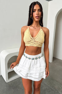 Step up your summer style game with our Valetta Crop! This playful top features back and neck tie up strings, giving you the perfect fit every time. The halter neckline and crochet material add a touch of bohemian charm. Pair her with denim shorts for an effortless and chic look this summer season!